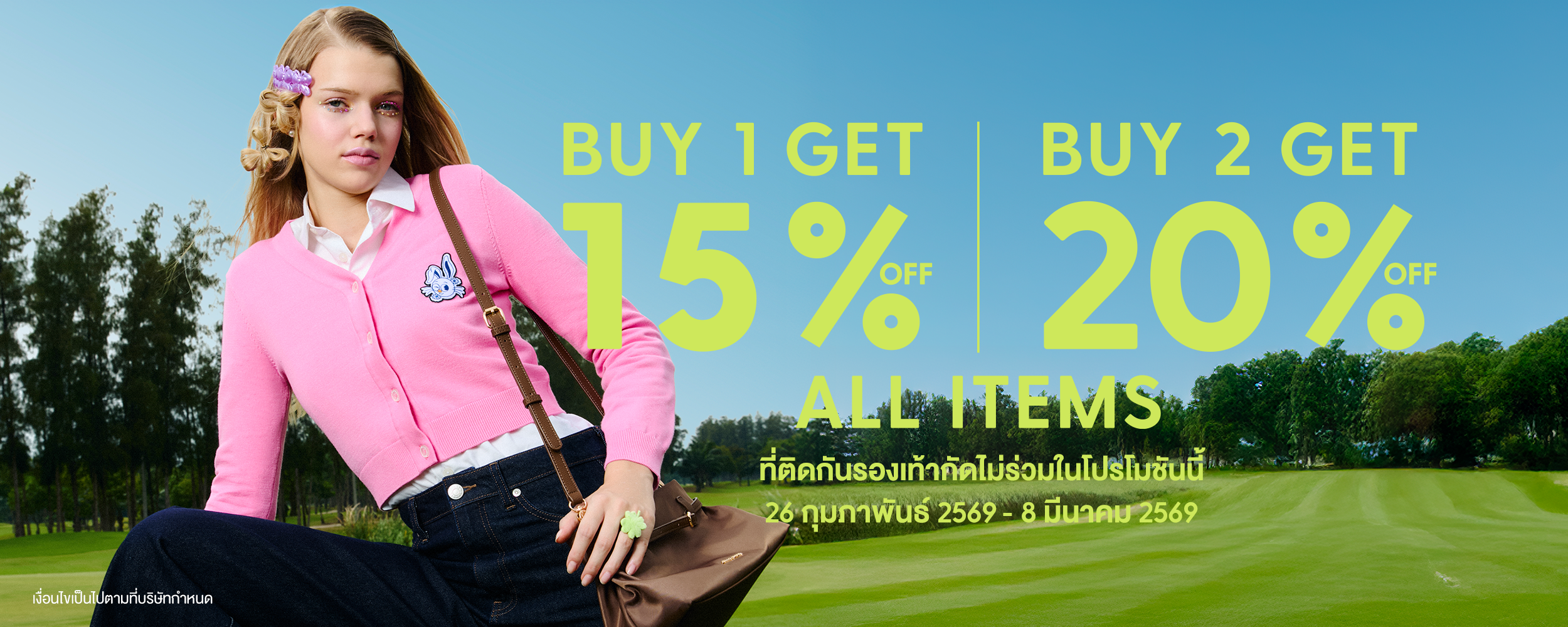 • รับส่วนลดทันที 15% เมื่อซื้อสินค้า 1 ชิ้นและรับส่วนลดเพิ่ม 5% เมื่อซื้อสินค้า 2 ชิ้นขึ้นไปเฉพาะสินค้าที่เข้าร่วมรายการเท่านั้น