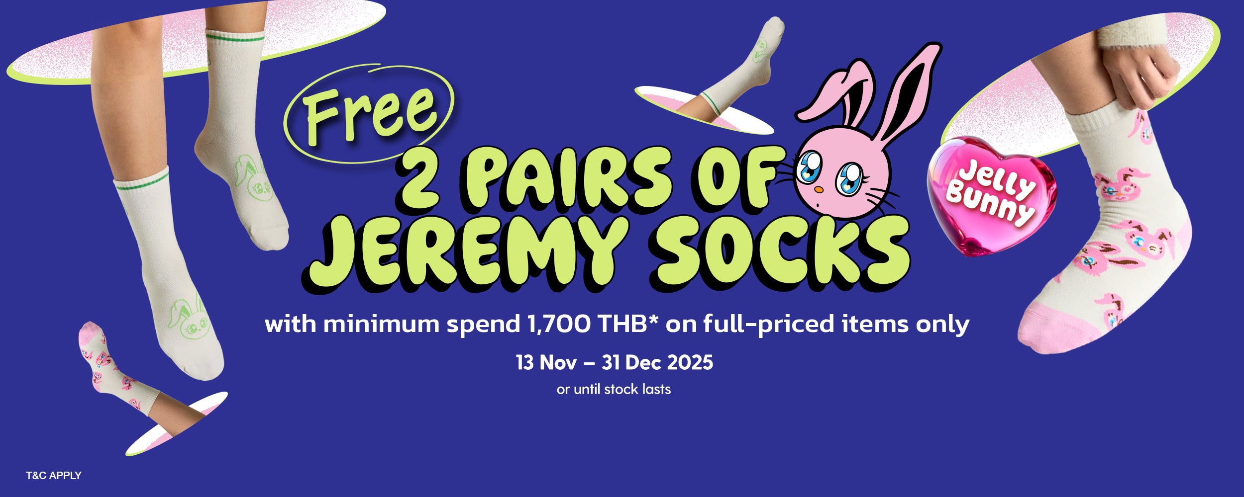• Get 2 pair of jeremy socks with minimum spend of 1,700 THB on full-priced items only